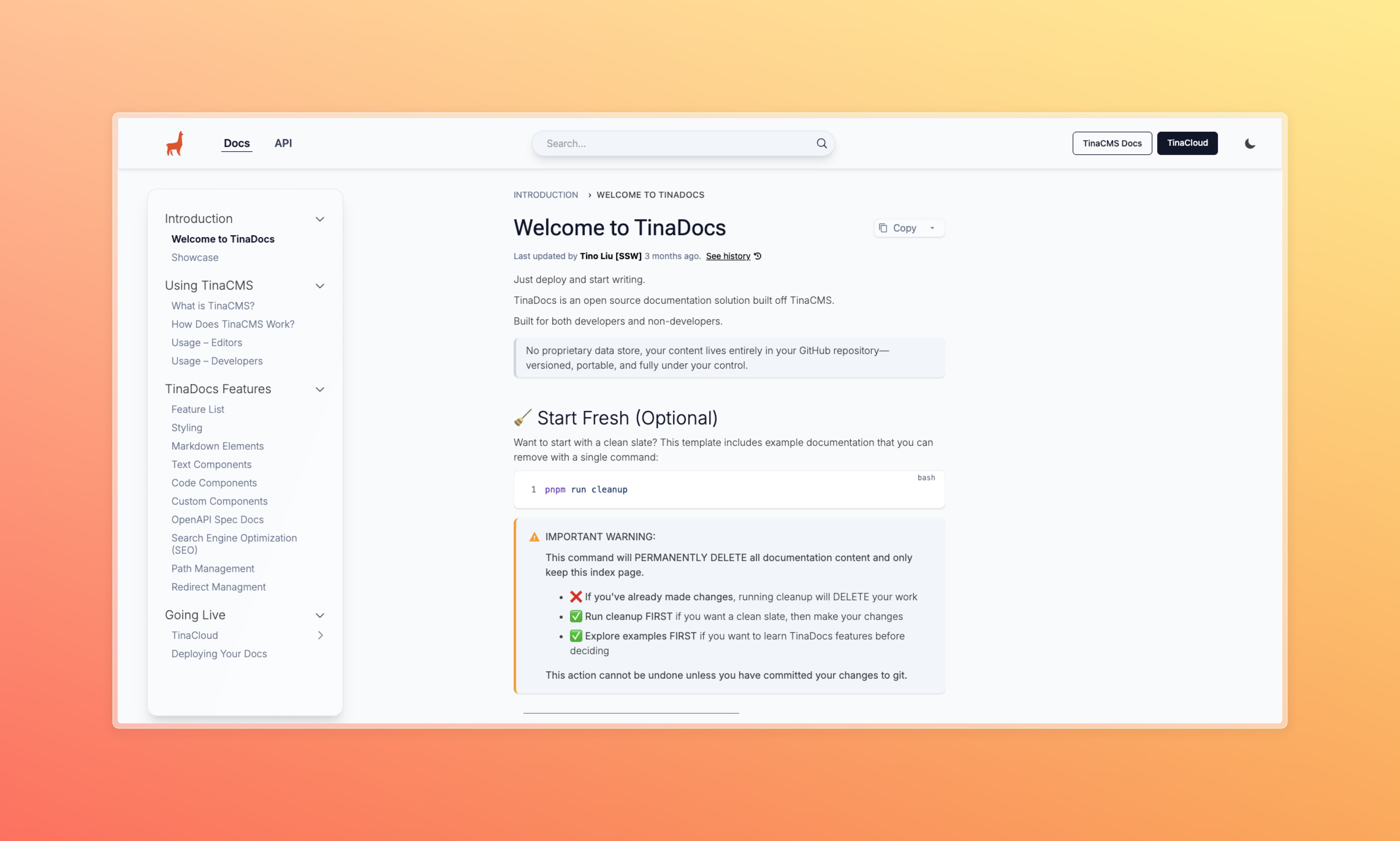 TinaDocs brings together years of documentation best practices with personal customizability and a rich feature set. It's built for both developers and non-developers, making it easy for your entire team to contribute to documentation without touching code.